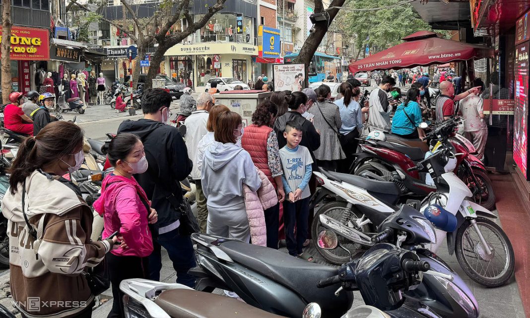 Khách xếp hàng để chờ mua vàng lúc 15h30 ngày 14/3 tại Trần Nhân Tông, Hà Nội. Ảnh: Anh Tú