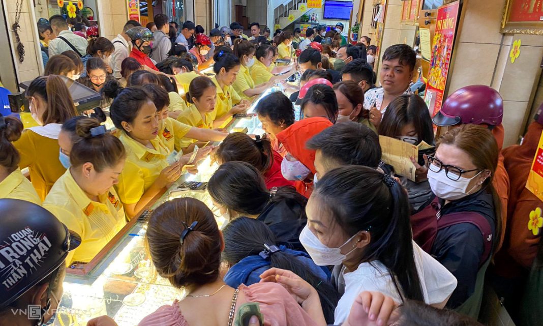 Tiệm vàng Mi Hồng, quận Bình Thạnh, TP HCM đông nghịt lúc 18h. Ảnh: Thanh Tùng