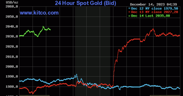 Giá vàng thế giới tăng mạnh sau khi chủ tịch Fed tuyên bố rằng “việc cắt giảm lãi suất đang bắt đầu được xem xét”. Các quan chức Fed dự kiến có ba đợt cắt giảm lãi suất, mỗi đợt 0,25% vào năm 2024.