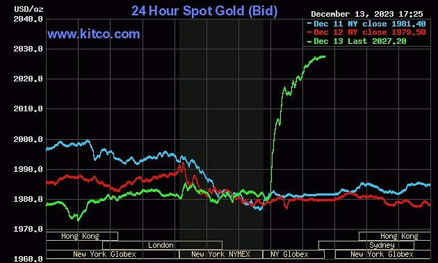 Giá vàng thế giới tăng vọt cuối phiên 13/12, sau thông báo của Fed.