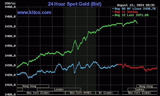 Chốt phiên giao dịch 12/8, giá vàng thế giới giao ngay tăng 42 USD, lên 2.472 USD một ounce. Đây là mức cao nhất kể từ đầu tháng.