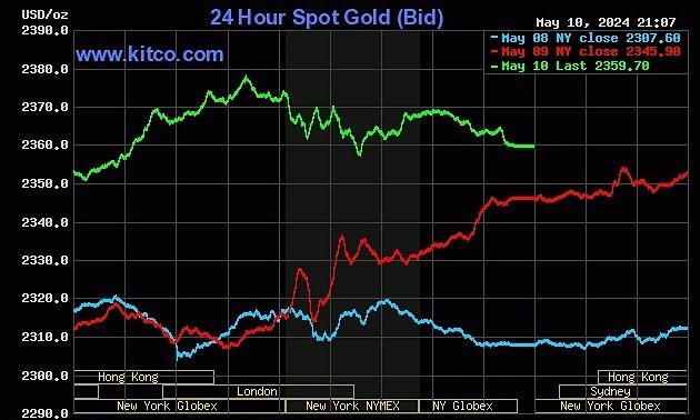 Chốt phiên giao dịch 10/5, giá vàng thế giới giao ngay tăng 14 USD lên 2.359 USD một ounce. Trong phiên, giá có thời điểm lên 2.375 USD.