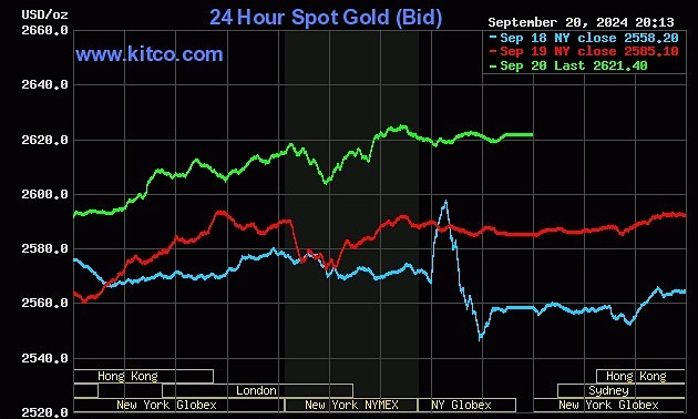 Chốt phiên giao dịch 20/9, mỗi ounce vàng thế giới giao ngay tăng 36 USD lên 2.621 USD. Đây là phiên thứ hai liên tiếp giá lập kỷ lục mới, sau khi Cục Dự trữ liên bang Mỹ (Fed) hôm 18/9 giảm lãi suất tham chiếu thêm 50 điểm cơ bản (0,5%). Lãi suất thấp có lợi cho vàng, do công cụ này không trả lãi cố định.