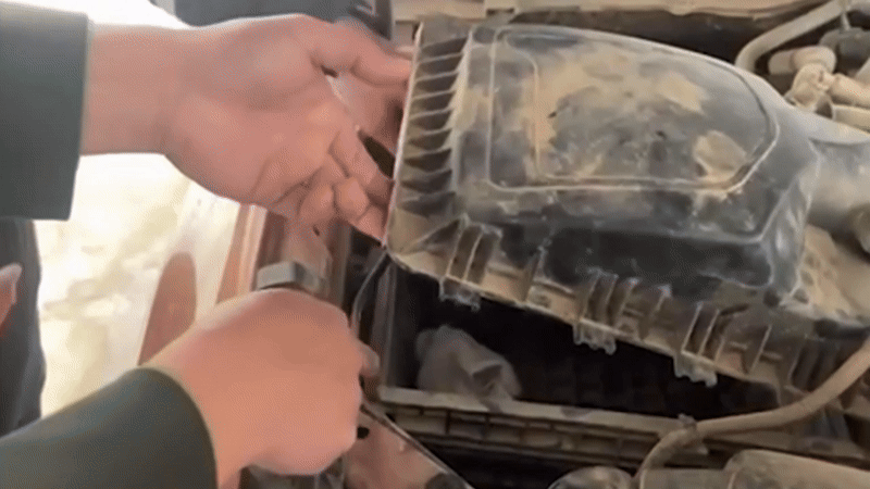 Hộp đựng lọc gió của ôtô bán tải được Thủy mở ra, giấu 7 cây vàng bên trong. Ảnh: Hùng Lê