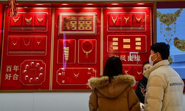 Hai khách hàng xem trang sức tại một tiệm vàng ở Tế Nam, thủ phủ tỉnh Sơn Đông, miền Đông Trung Quốc, tháng 1/2024. Ảnh: Xinhua