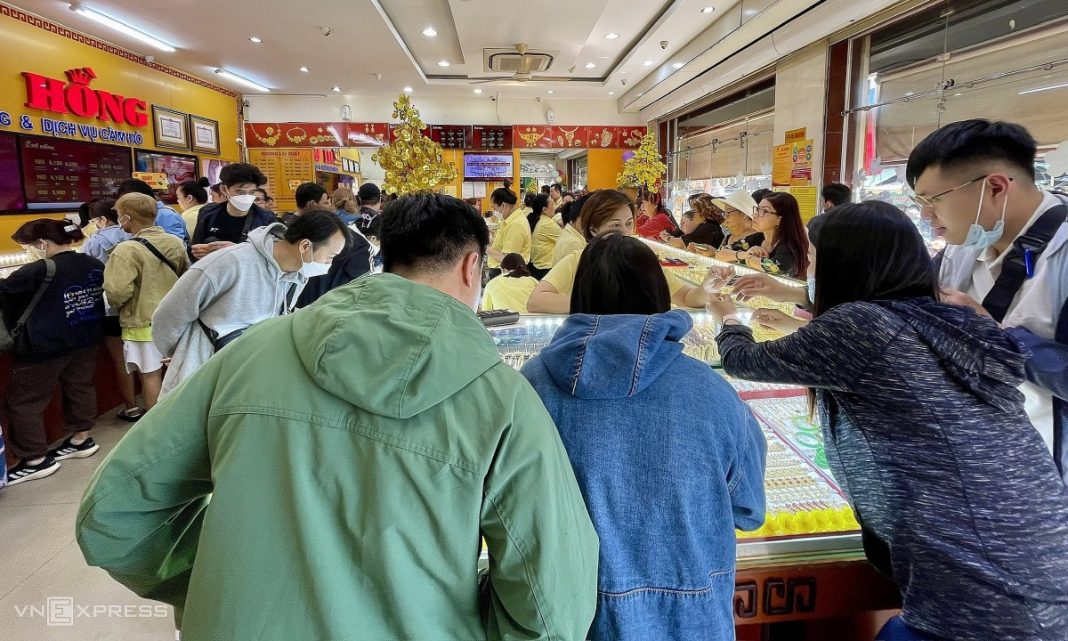 Một góc tiệm vàng Mi Hồng chật kín chỗ đứng đầu giờ chiều ngày 18/2, tức ngày mồng 9 tháng Giêng. Ảnh: Quỳnh Trang