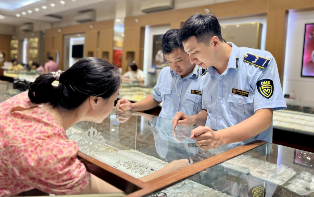Tổng cục quản lý thị trường kiểm tra cửa hàng vàng tại Hà Nội. Ảnh: QLTT